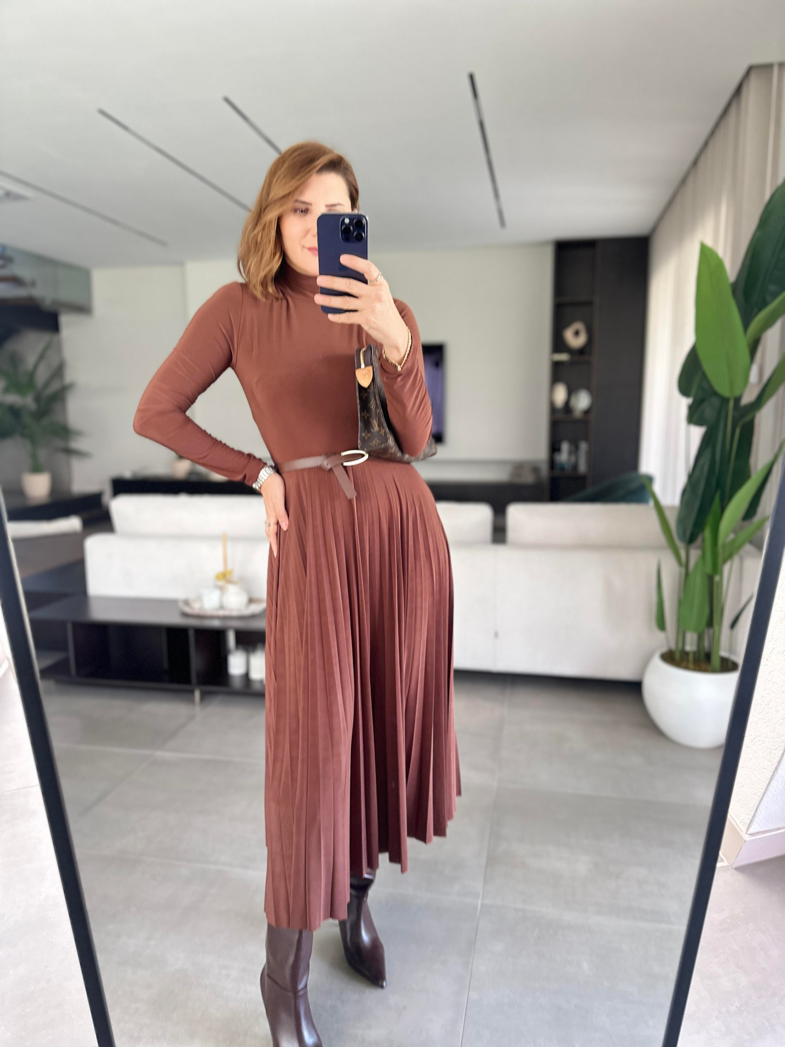 Acı Kahve Sandy Kemer Detaylı Piliseli Elbise