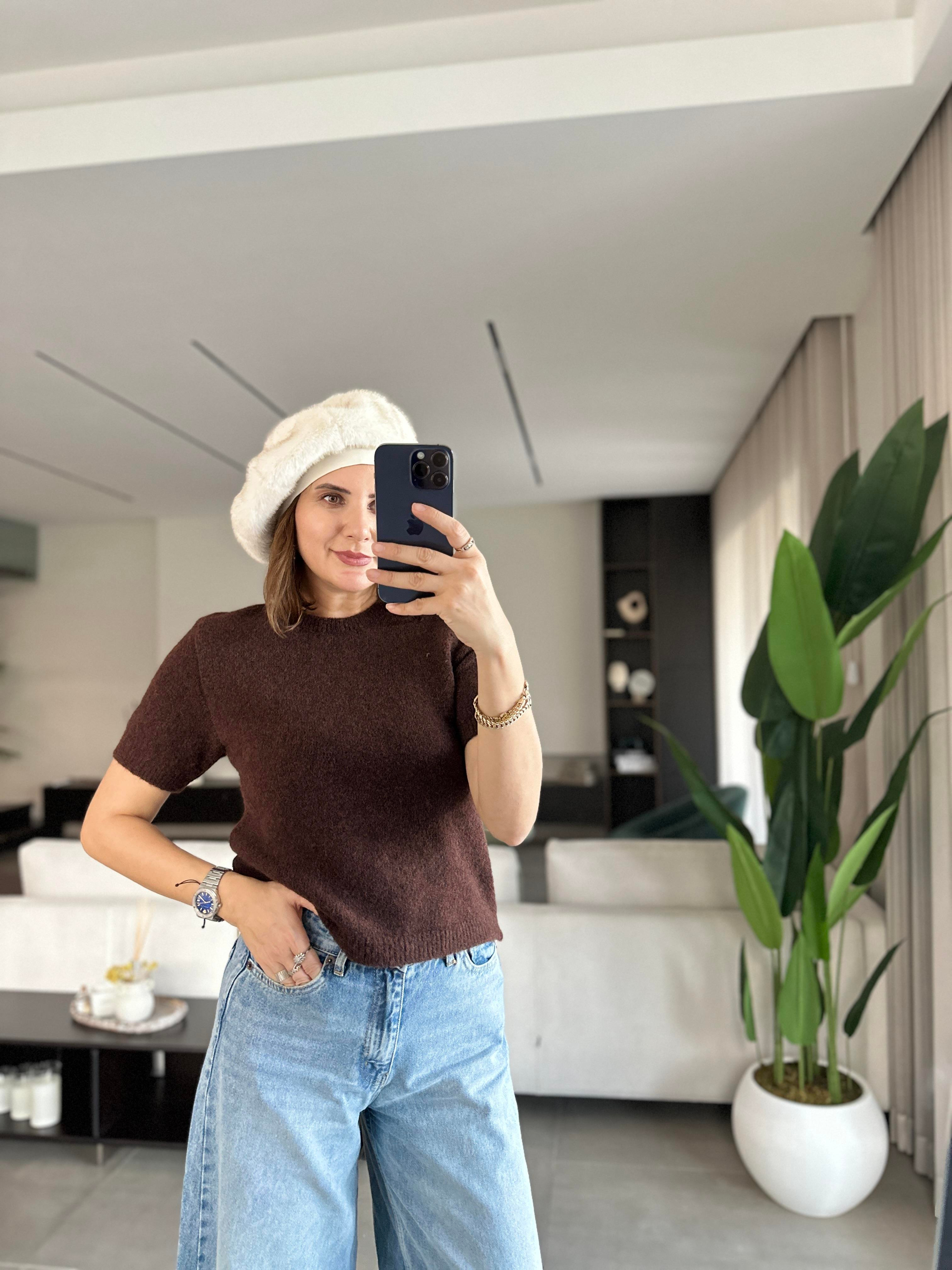 Acı Kahve Şardonlu Kısa Kollu Kazak