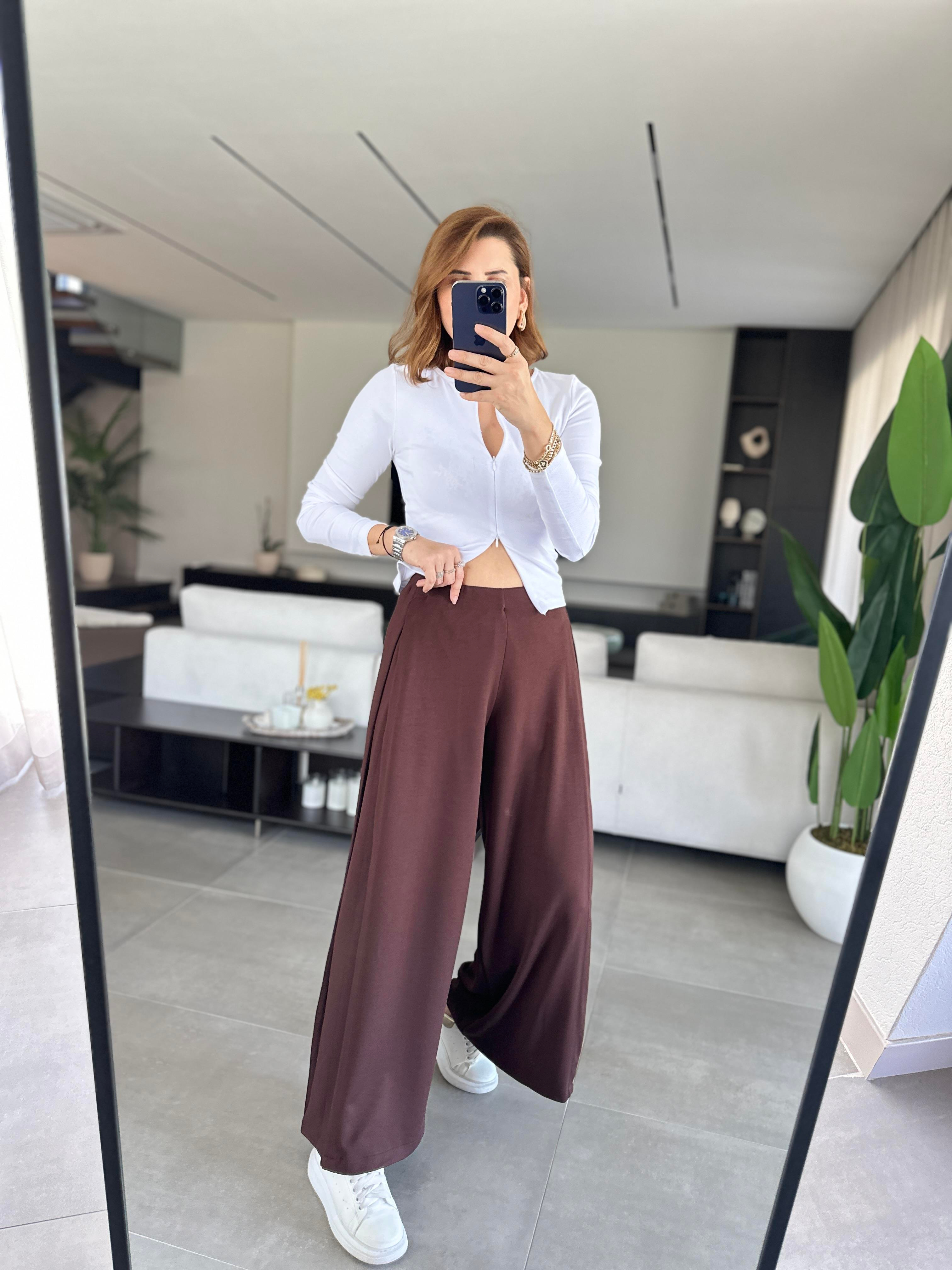 Acı Kahve Yan Pileli Palazzo Pantolon