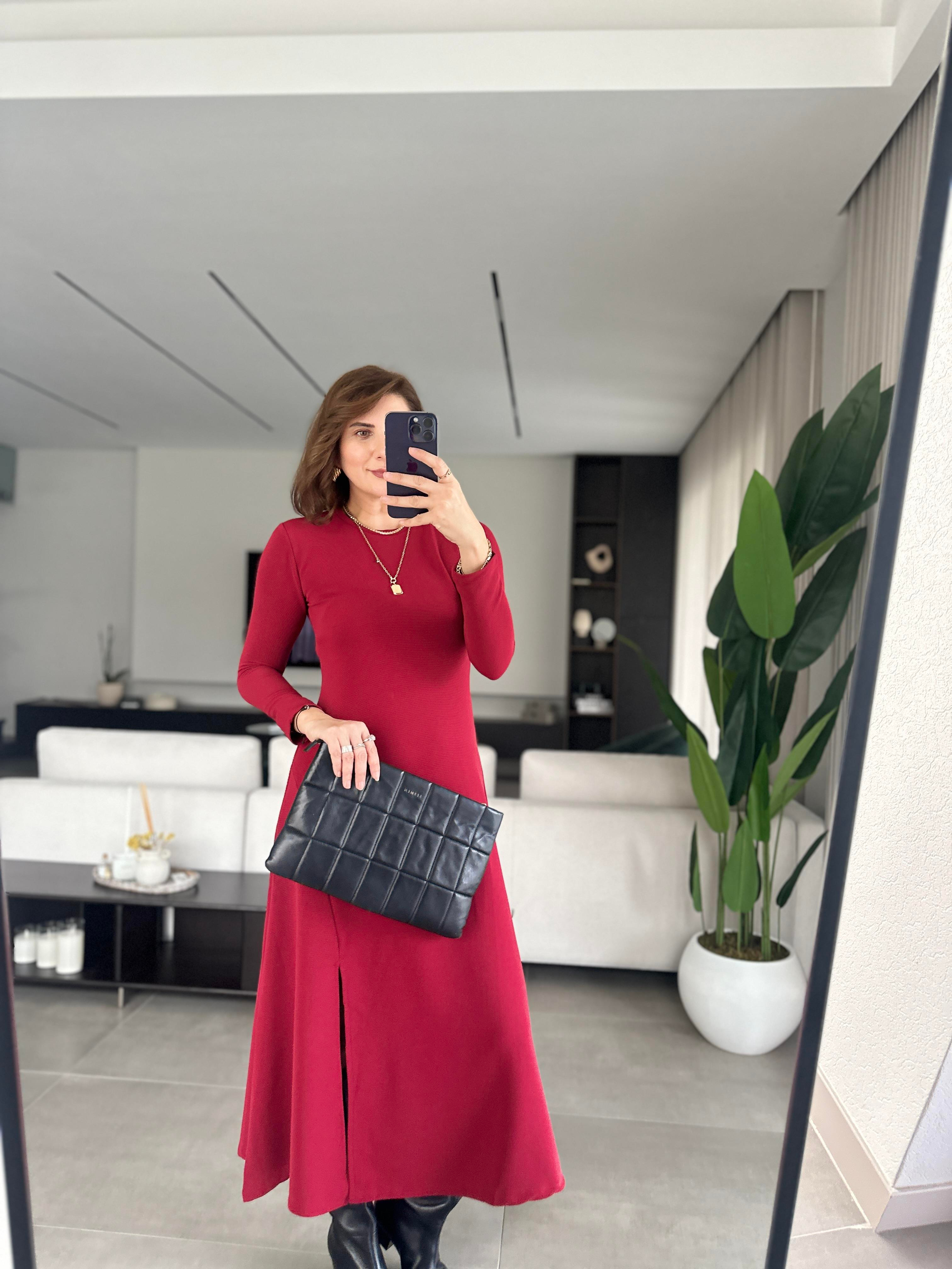 Bordo Yırtmaç Detaylı Elbise (0900b)