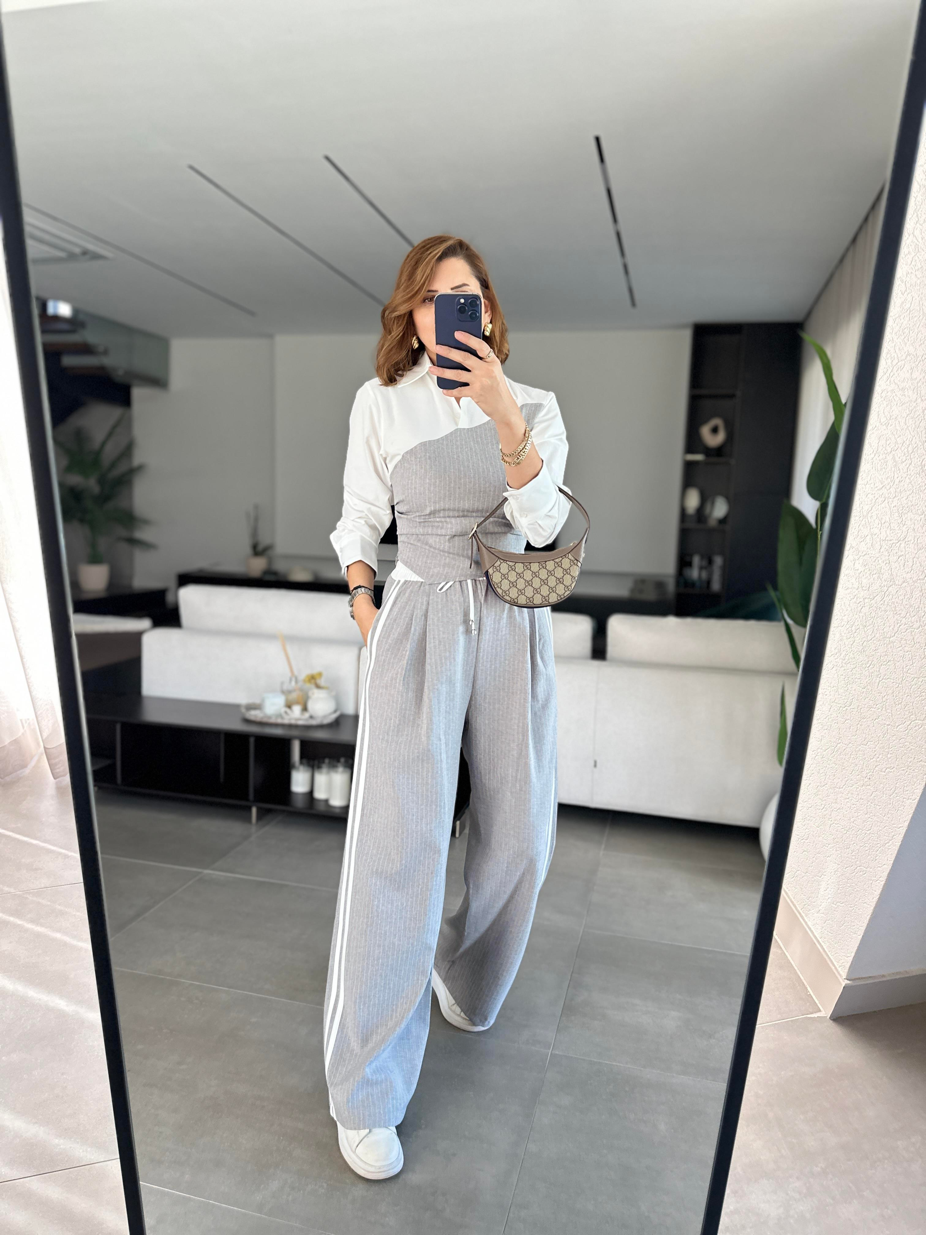 Çizgili Kumaş Bluzlu Biye Detaylı Pantolon Takım