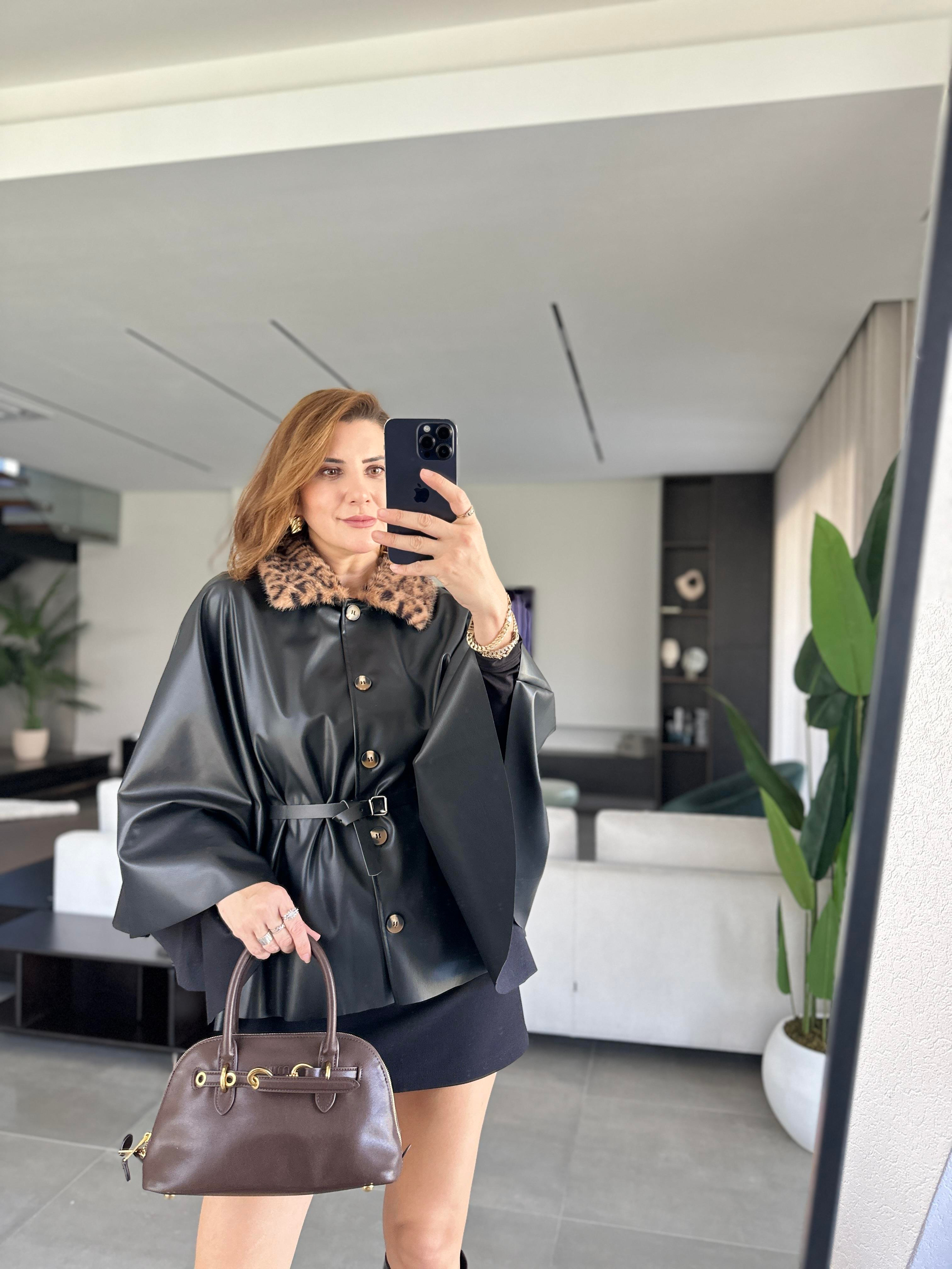 Kürk Yakalı Leopar Desenli Deri Ceket