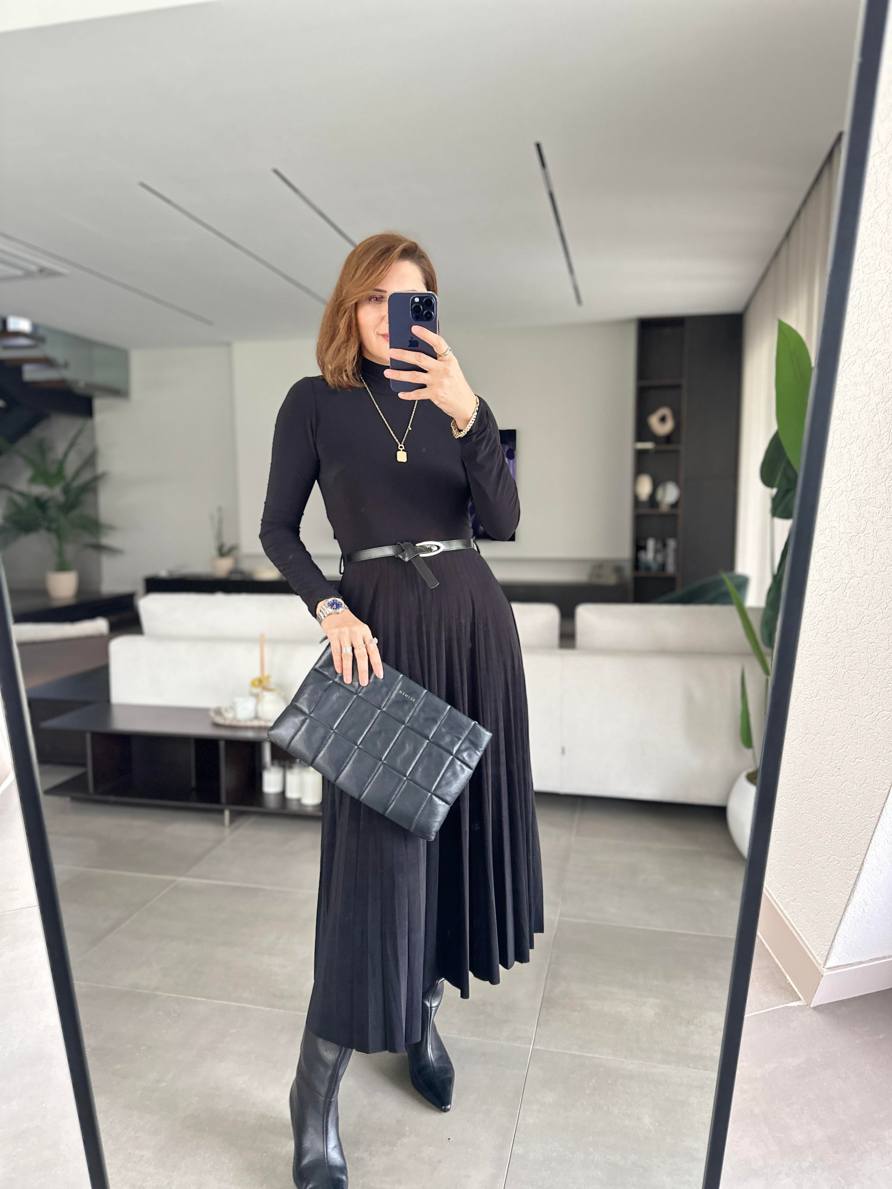 Siyah Sandy Kemer Detaylı Piliseli Elbise